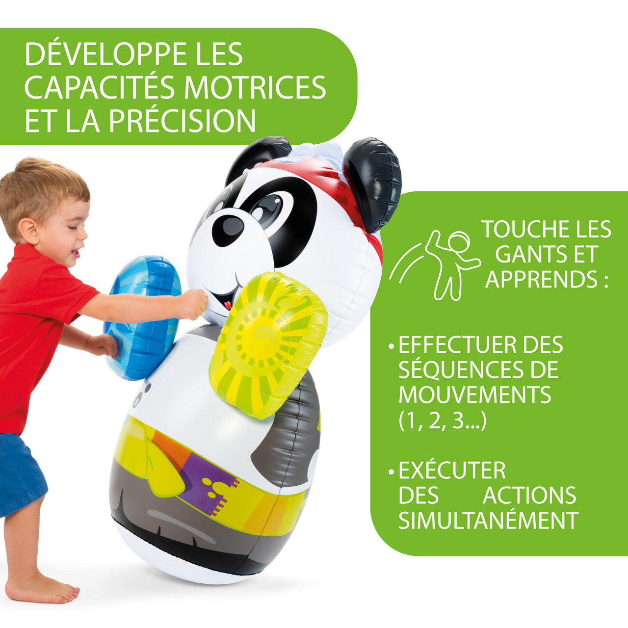 - SAC DE FRAPPE GONFLABLE : Les gants indiquent où l'enfant doit taper et l'aident à développer ses capacités motrices et sa précision.